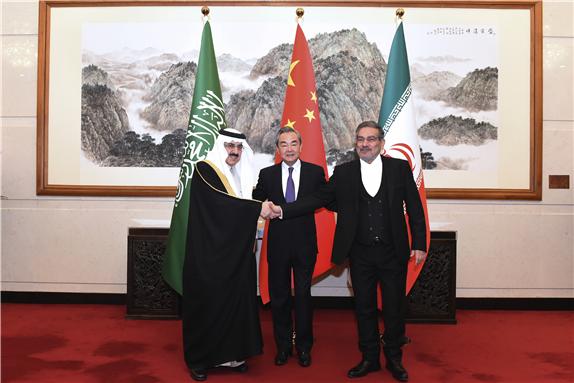 3월 11일 중국 베이징에서 무사드 빈 무함마드 알아이반 사우디아라비아 국가안보 보좌관(왼쪽)이 왕이 중국 공산당 중앙정치국 위원을 가운데 두고 이란 최고 지도자인 아야톨라 알리 하메네이의 측근인 알리 샴카니 최고국가안보회의(NSC) 의장(오른쪽)과 악수하고 있다.