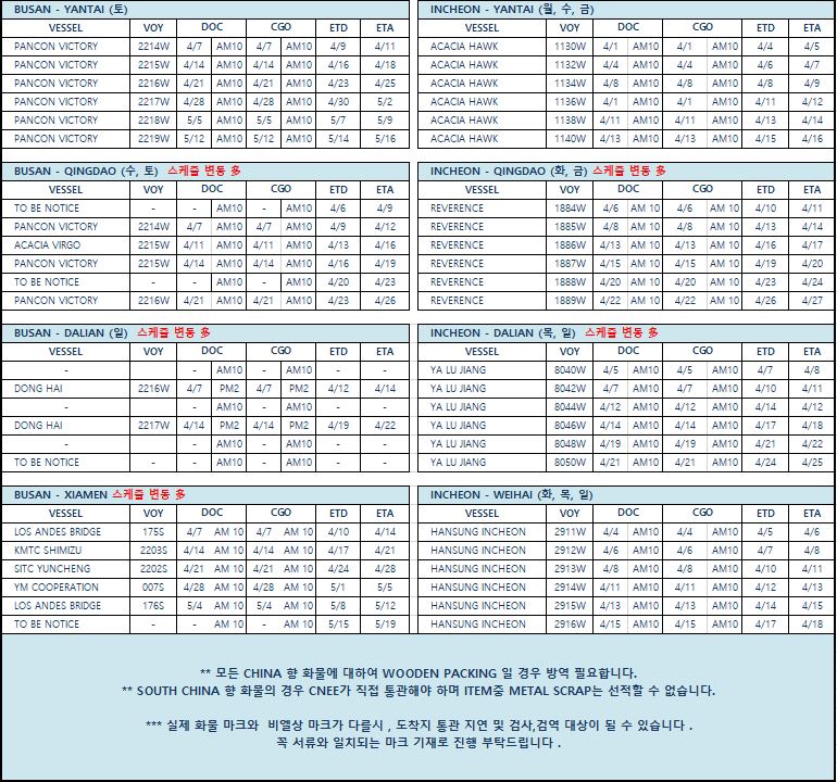 ▣ 기타지역, 항공, FCL 화물의 스케줄은 이메일 또는 전화로 문의주십시오