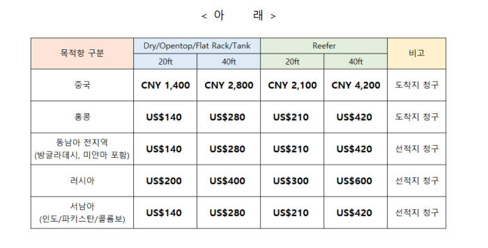 한국 수출화물 부대비 LSS요율 변경 안내 (23년 1분기)